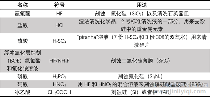 我們大致可以將其分為三類:酸(如氫氟酸、硝酸、硫酸等)、堿(氫氧化鉀、氫氧化鈉、氫氧化銨等)、溶劑(異丙醇、丙酮等),本篇主要給大家介紹酸。
